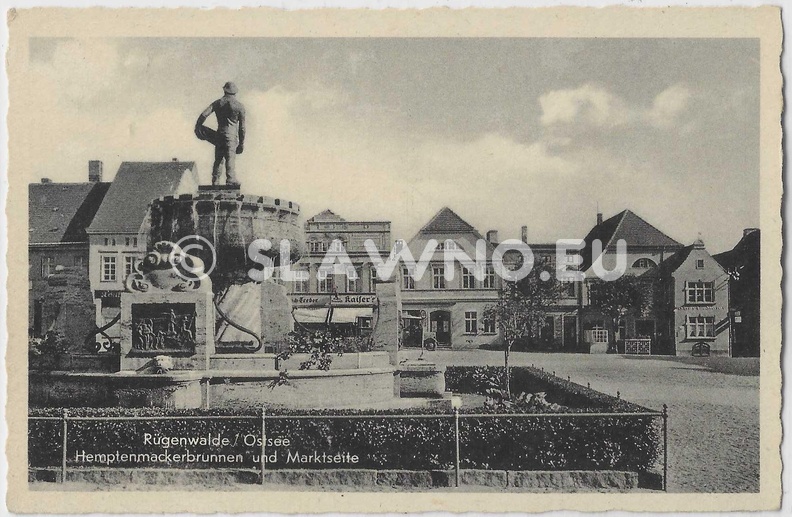 Oryginalny napis: Rügenwalde / Ostsee – Hemptenmackerbrunnen und Marktseite